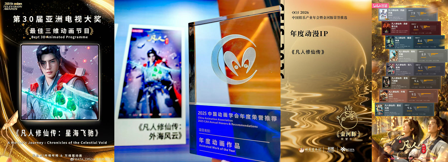 截至目前(动画第176集),《凡人修仙传》动画在B站追更人数超1500万,25年更新期间仅B站新增投稿5万+,为B站年度国产动画二创热度榜第一,是名副其实的“国创典范”。在行业内,凡人动画一年揽获多项重磅荣誉:豆瓣2025评分最高动画剧集、2025微博文化之夜“年度国漫IP”、第30届亚洲电视大奖“最佳三维动画节目”、2025中国动画学会荣誉推荐年度动画作品,更被央媒以年度关键词点名表彰。